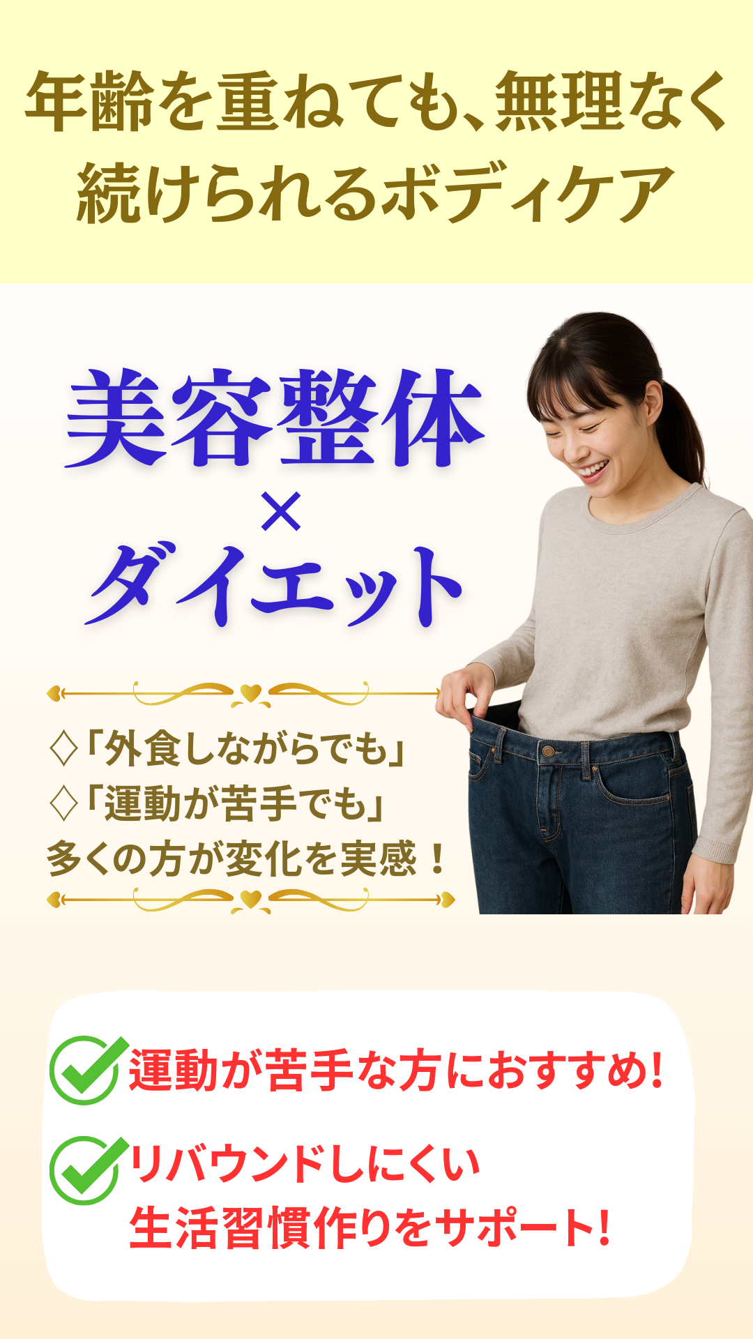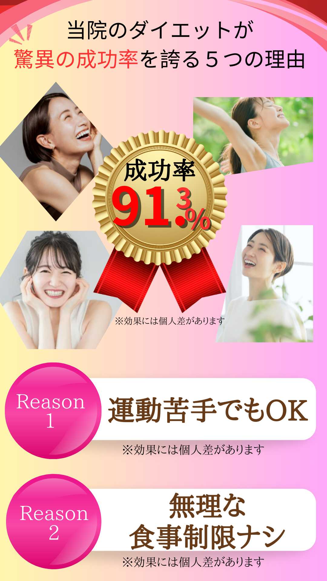 ダイエットと聞くと、小難しいカロリー計算だったり、運動が大事とよく聞くと思いますが、当院では一切必要ありません。