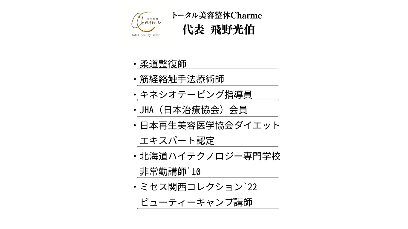 トータル美容整体Charmeでは、私、飛野があなたのダイエットを最初から最後まで責任を持ってサポートいたします。